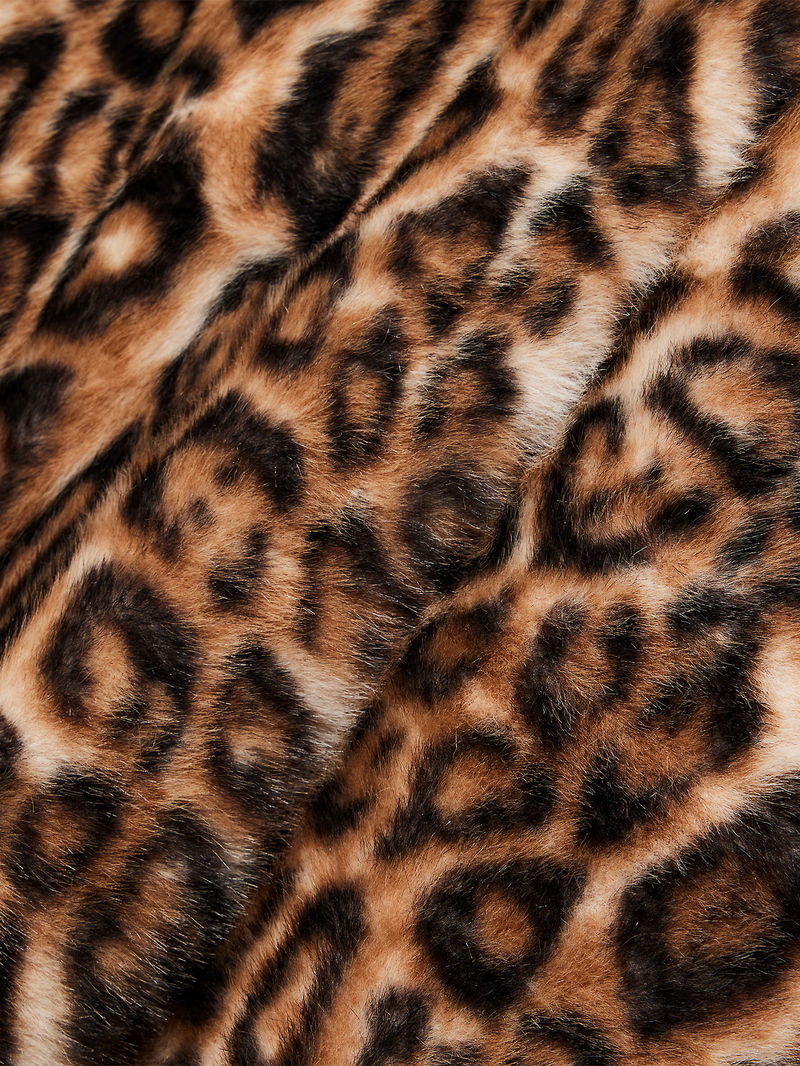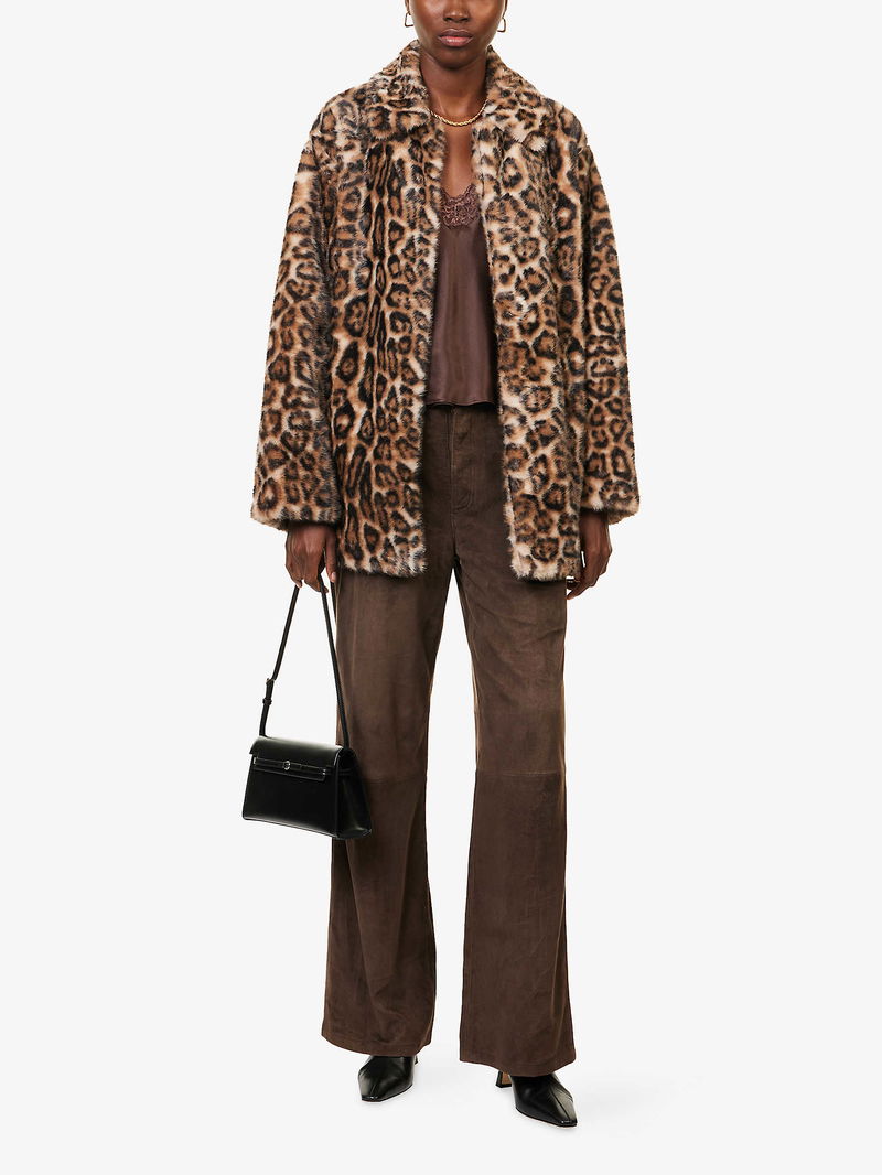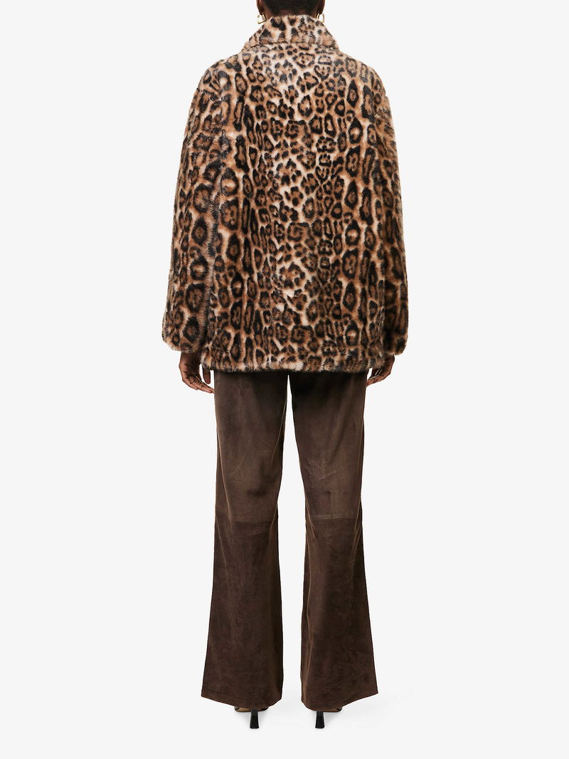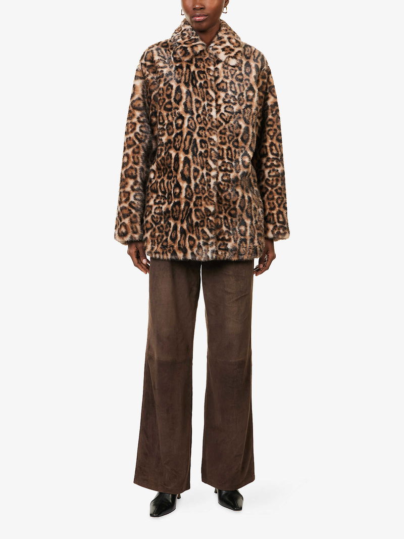 Reformation faux-fur coat. Concealed magnetic fastenings at front. Relaxed fit, collar, dropped shoulders, long sleeves, two side slip pockets, all-over leopard pattern, faux-fur texture, fully lined.