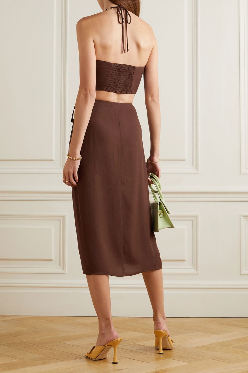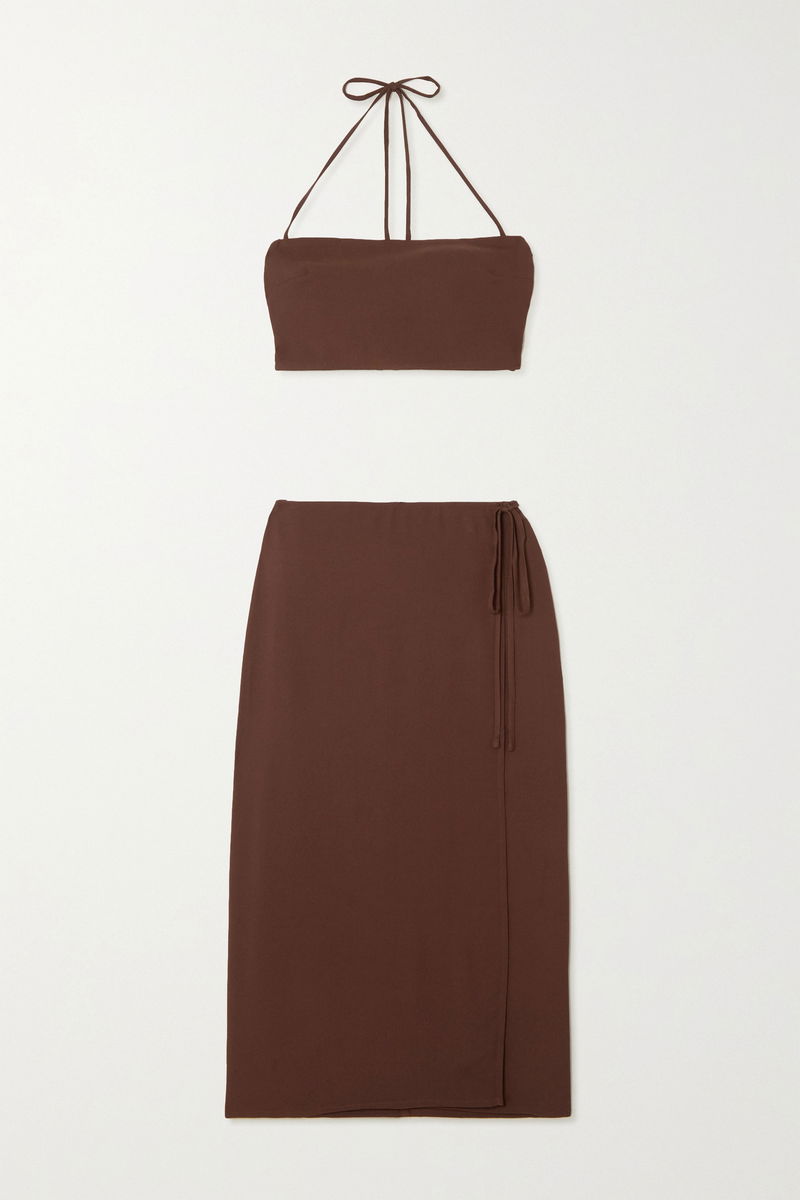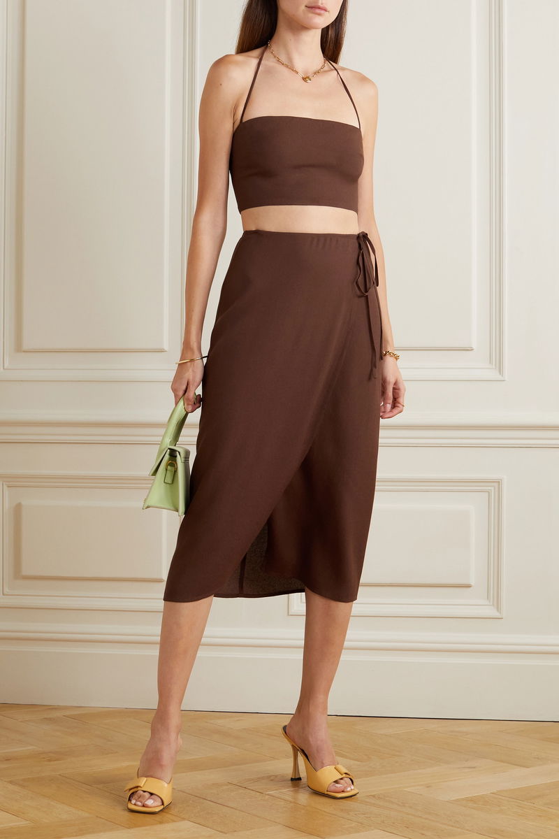 Coordinating sets prove a failsafe choice for effortlessly elegant dressing, particularly if you're on vacation. Reformation's aptly named 'Voyage' set is cut from airy crepe that'll help you stay cool in humid climes. The halterneck top is cropped, while the adjustable wrap skirt has a thigh-skimming front split.