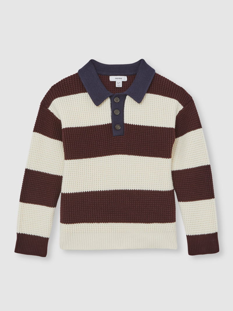 13-14 Yrs Cotton-Blend Rugby Stripe Polo Jumper In Brown/ Off White/ Navy Blue