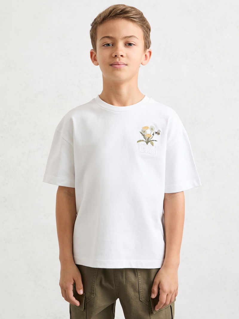 The Dean T-shirt is crafted from 100% cotton with dandelion logo embroidery at the chest and a printed graphic on the back. It has a crew neckline and short sleeves.