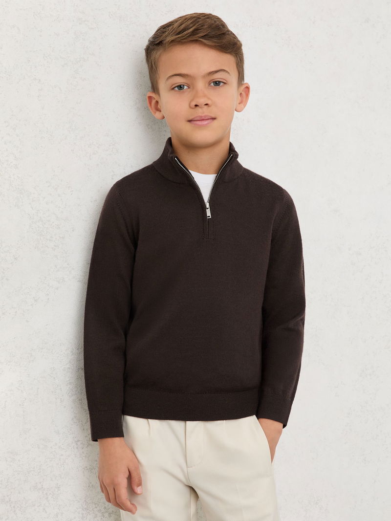 13-14 Yrs Merino Wool Half-Zip Funnel Neck Jumper In Chocolate Brown
