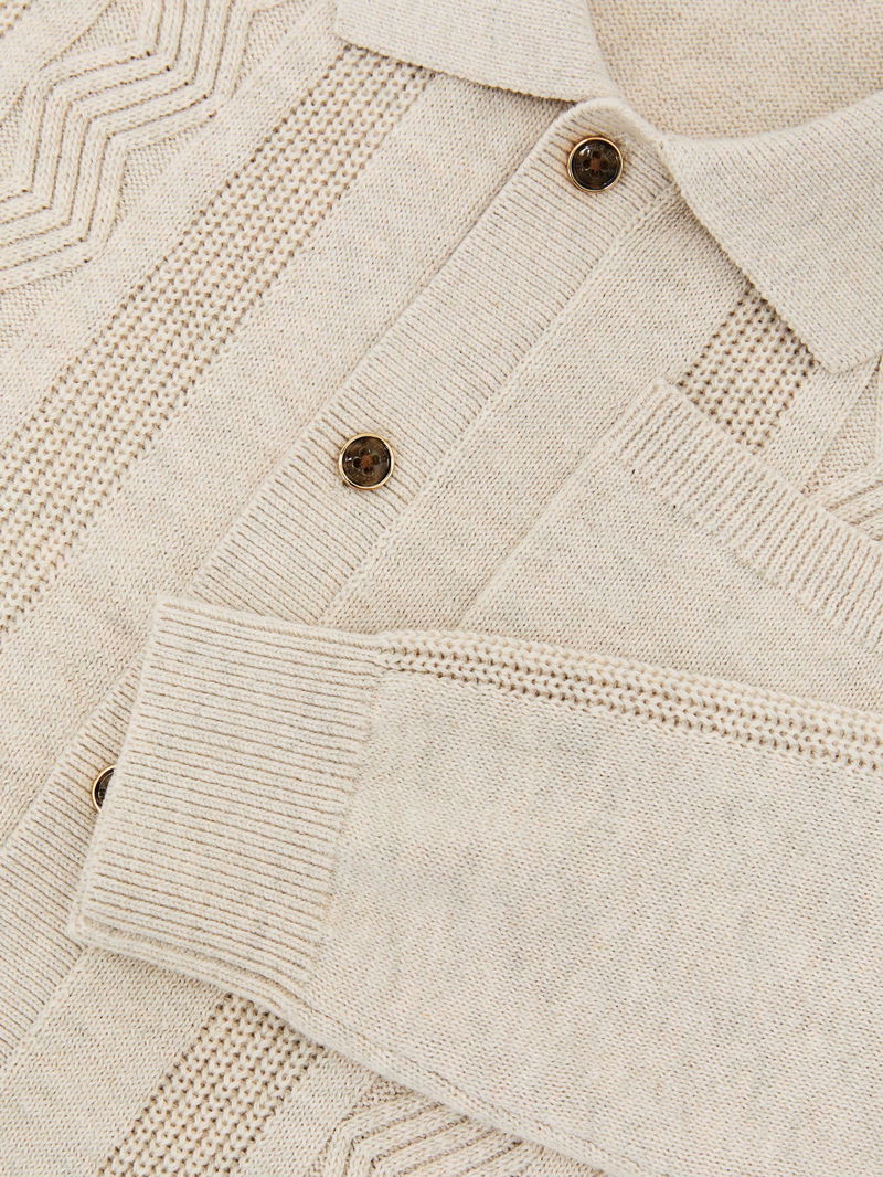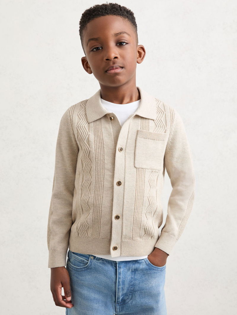 13-14 Yrs Stitch-Detail Polo-Collar Cardigan Cotton-Blend In Oatmeal