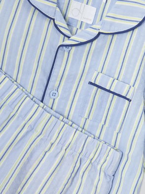 The Slumber pyjama set is woven with narrow stripes for a classic sleepwear aesthetic. It includes a collared button-through shirt with a chest pocket, and matching trousers with an elasticated waistband and side pockets. It s finished with piped edges for a refined look.
