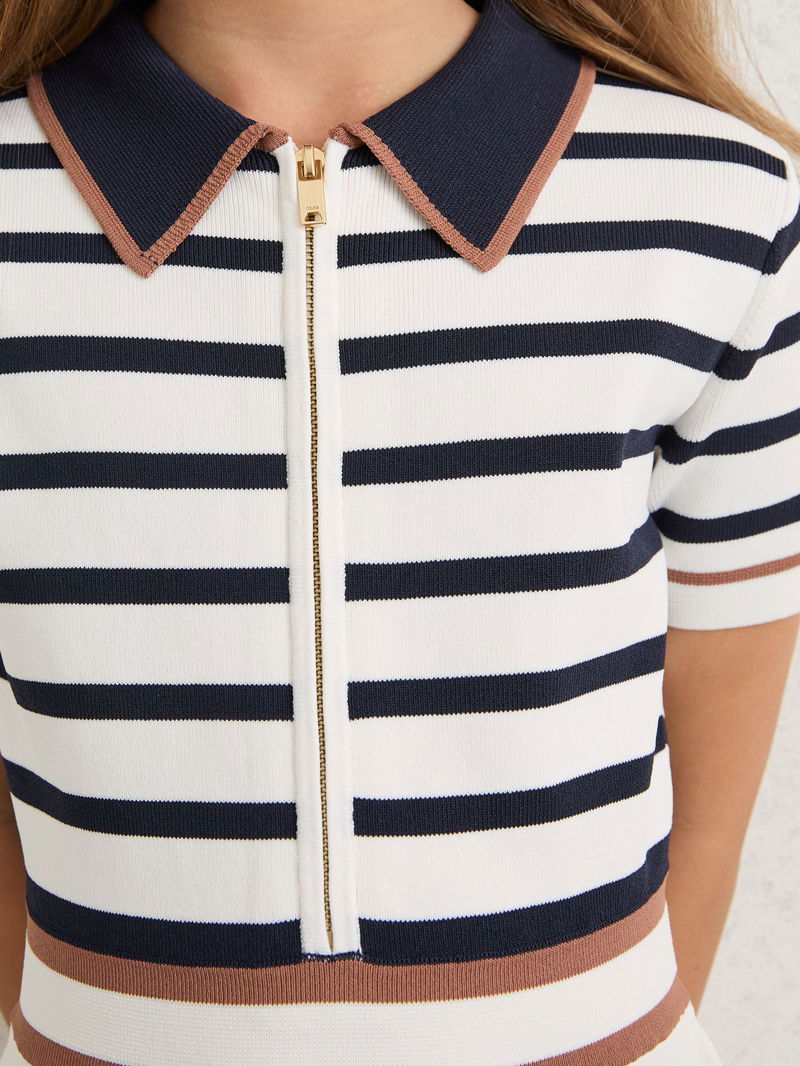 9-13 Yrs Cotton Collared Stripe Knit Dress In Ivory