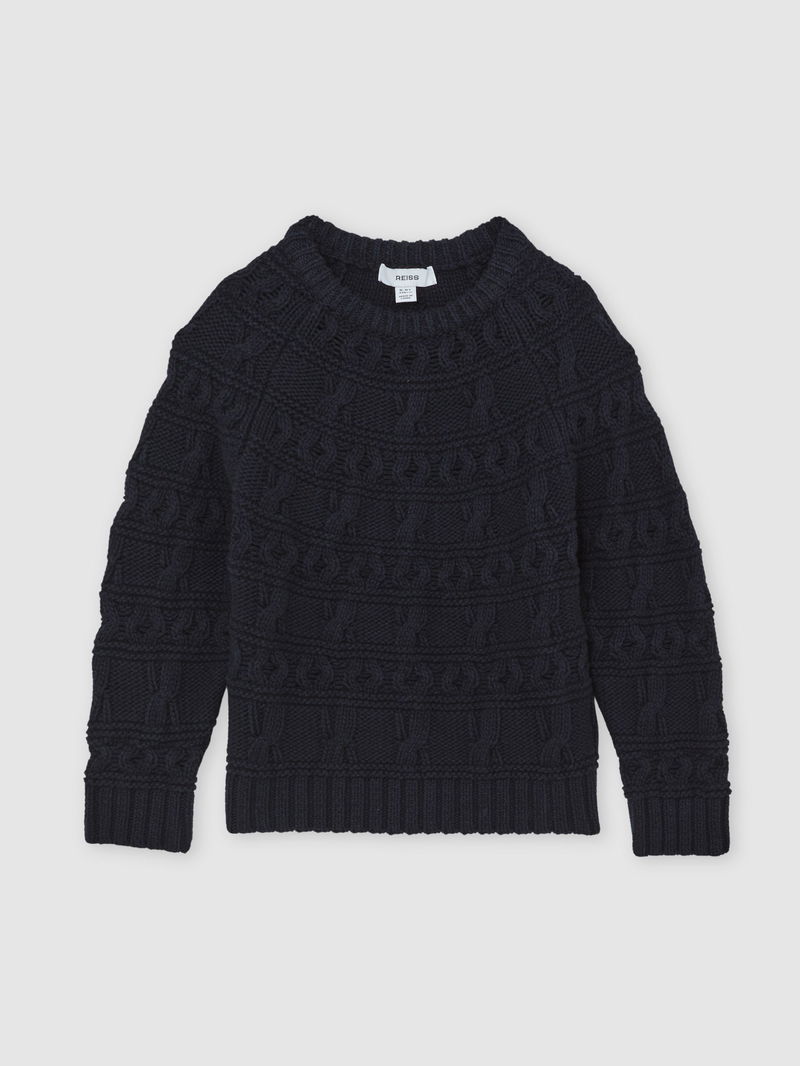 9-13 Yrs Wool-Cotton Cable-Knit Jumper In Navy