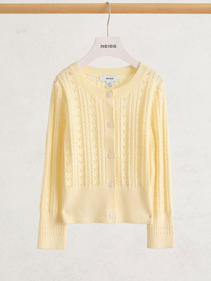 9-13 Yrs Wool-Cotton Pointelle Cardigan In Lemon
