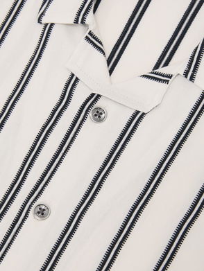 A painterly abstract print defines the fluid Maki Blue shirt. The Cuban collar and short sleeves enhance its relaxed edge.