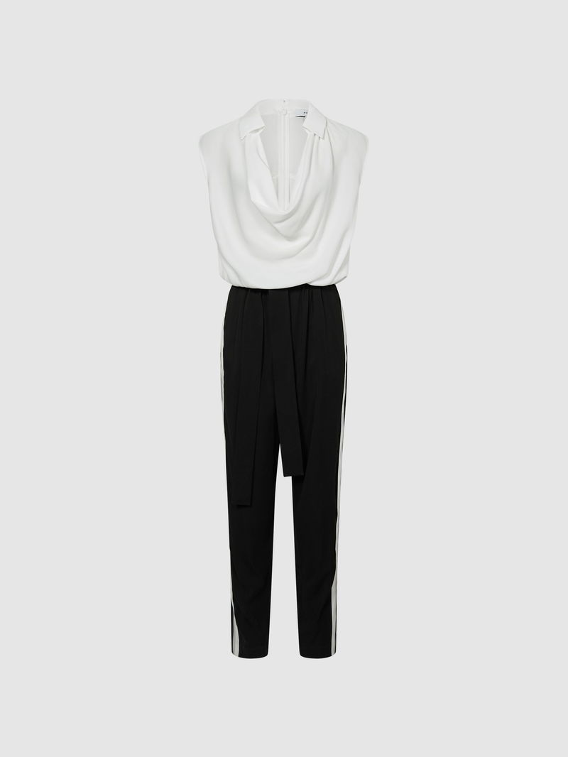 Give your workday collection an upgrade with the Allie jumpsuit. It s crafted with a shirt-style collar and a cowl neckline. This style features sportive side stripes and an elasticated waistband, a nod to the coveted athleisure trend. The tapered leg and self-tie waist keep it elegant. Add strappy sandal heels for a polished office look.