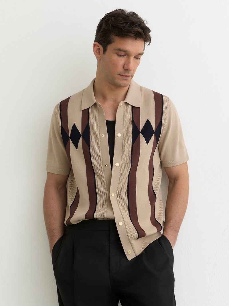 Argyle-Knit Press-Stud Polo Shirt In Camel Brown