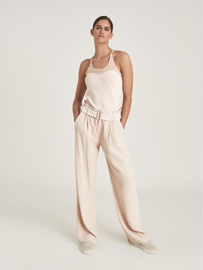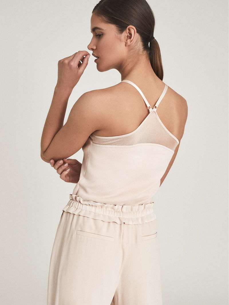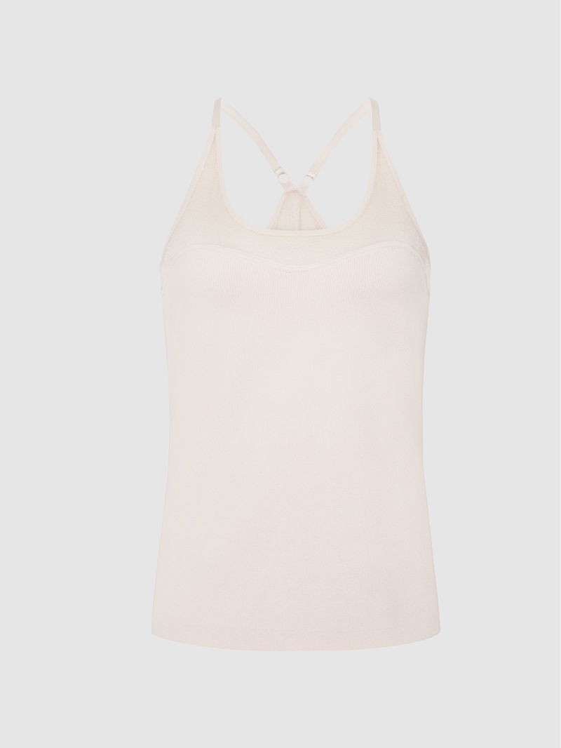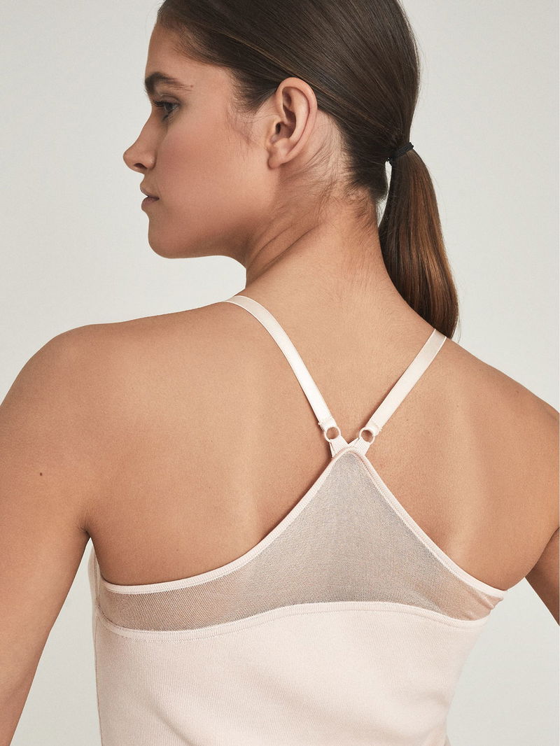 The Ariah top in blush is an elevated evening take on a classic cami silhouette. It’s knitted with a semi-sheer panel to add interest to your look. Wear it with slim-leg trousers and trainers, adding a blazer for a glamorous after-hours look.