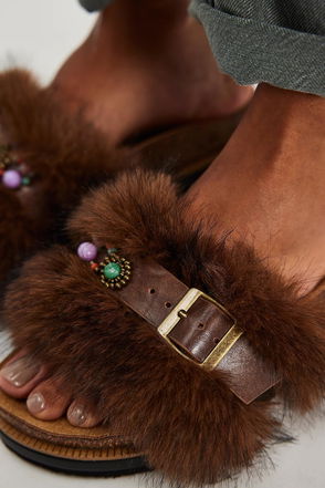 Embrace the luxuriously sumptuous feel of Aspen – cosy slippers crafted from ecru-shaded faux fur. They're crafted with a cross strap construction that falls to an open toe. Wear them on lazy weekends.