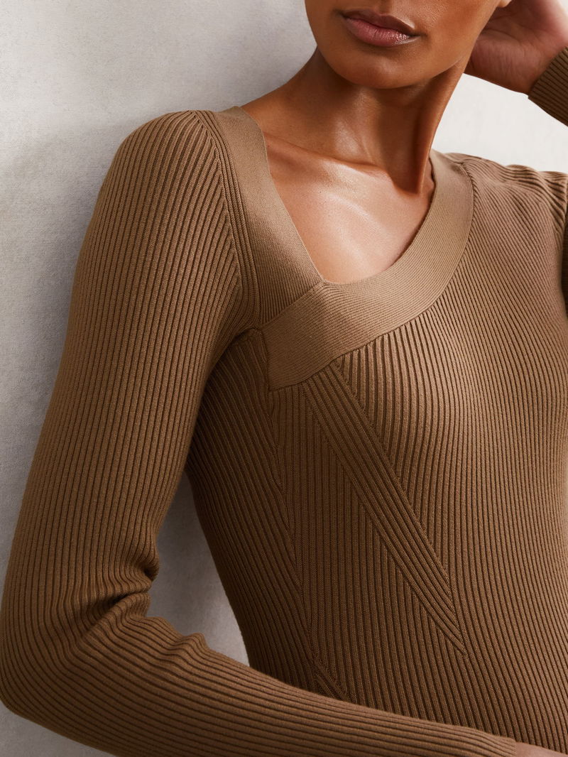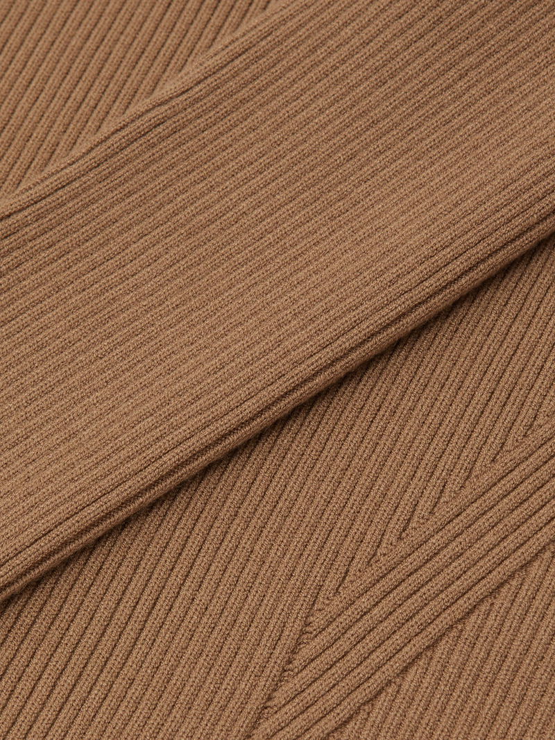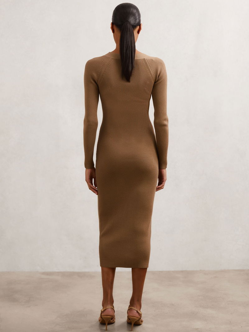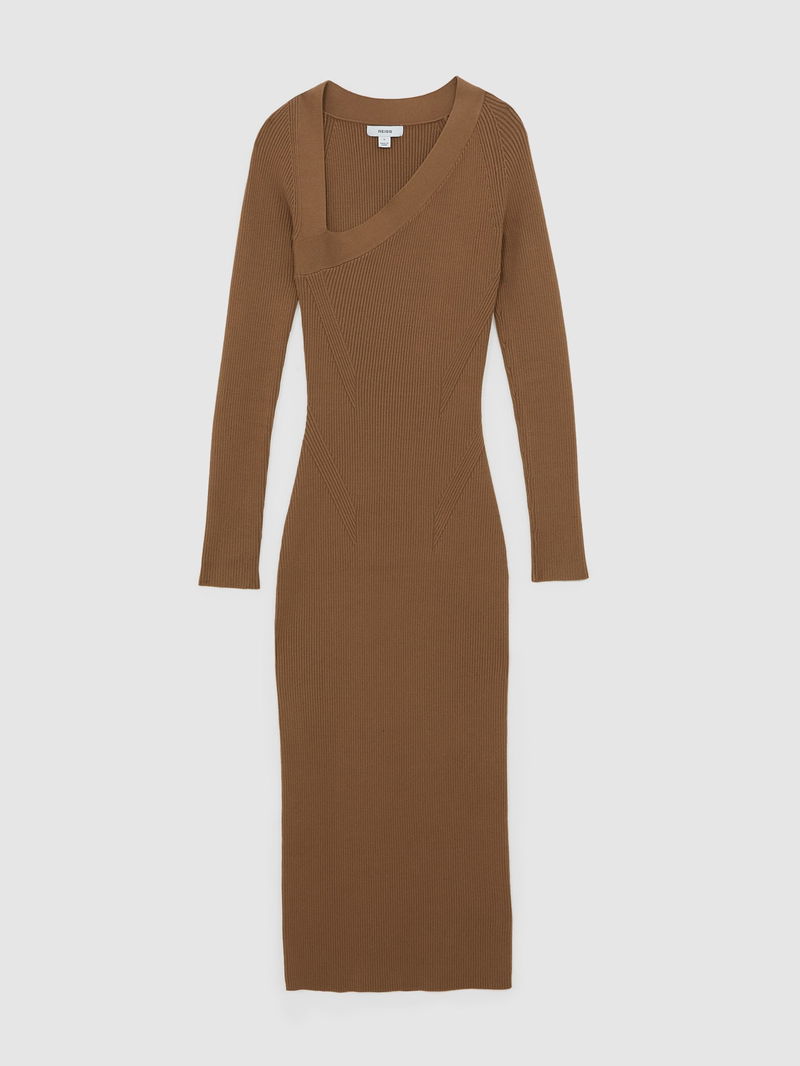 Asymmetric-Neck Rib-Knit Midi Dress In Camel