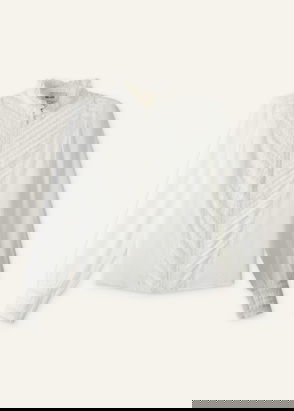 The Noemie top is crafted with a band collar that’s framed by an elegant keyhole and tucks that release fullness into the piece. Rendered in floaty faille, it’s accented with drop-shoulder sleeves then pleated at the yoke and French cuffs.