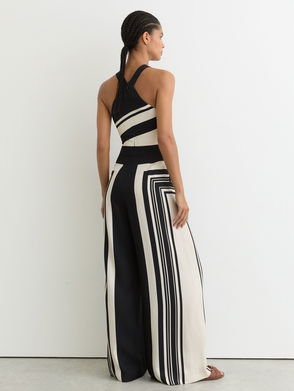 Satin-trimmed lapels and a matching waistband give the Gaia jumpsuit tuxedo-inspired elegance. Lightly padded shoulders add subtle structure, while wide legs with pintucks create a refined silhouette, perfect for evening and formal occasions.