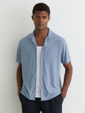 The Archer shirt is crafted from a textured compact knit and defined by bold Aztec stripes for a striking, graphic look. A Cuban collar and side notches at the hem add relaxed, modern details.