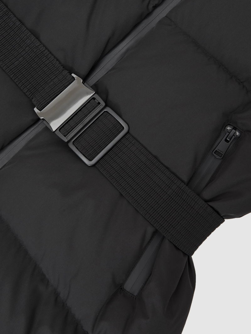 Belted Longline Hooded Puffer Coat In Black