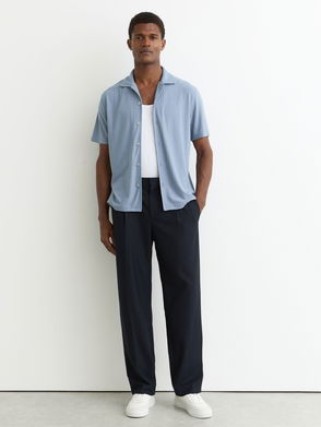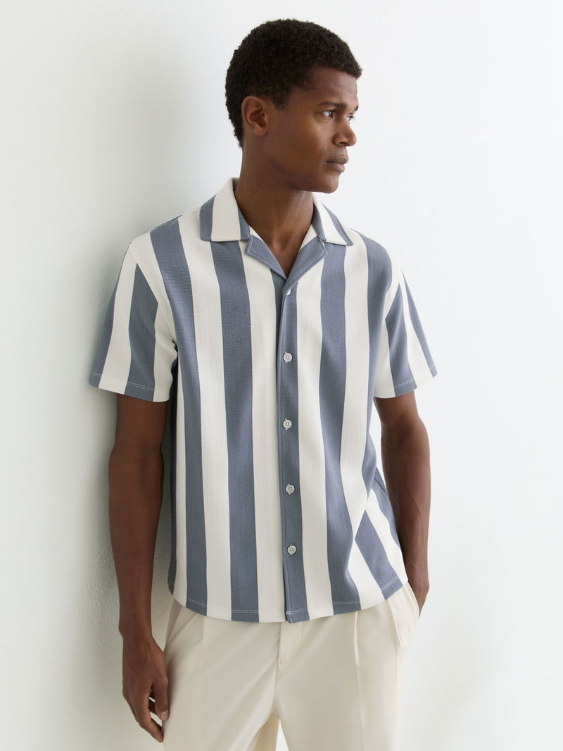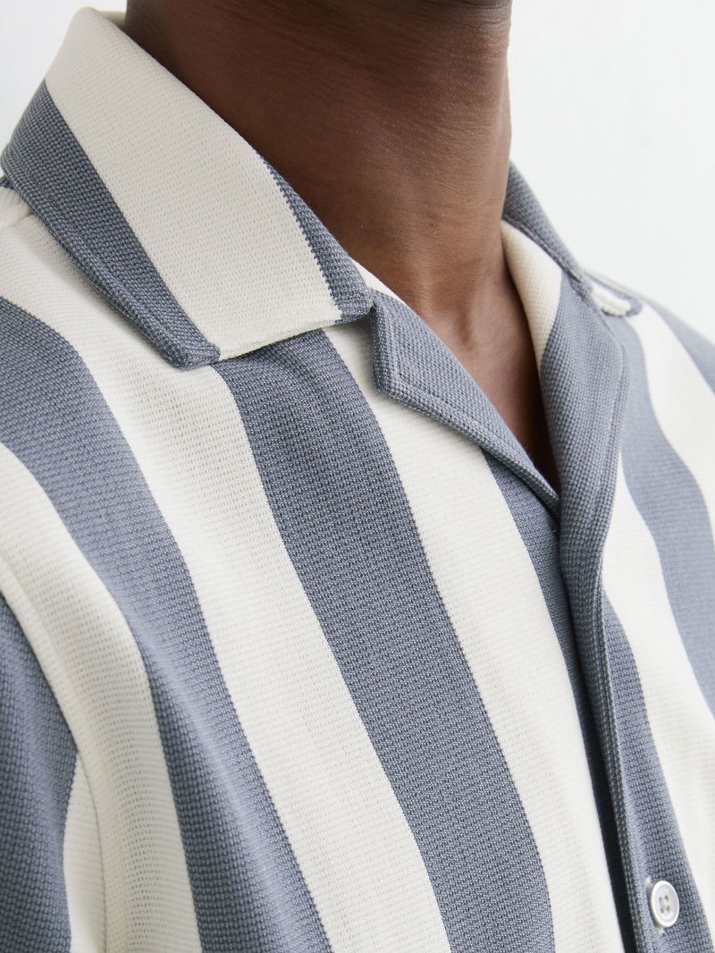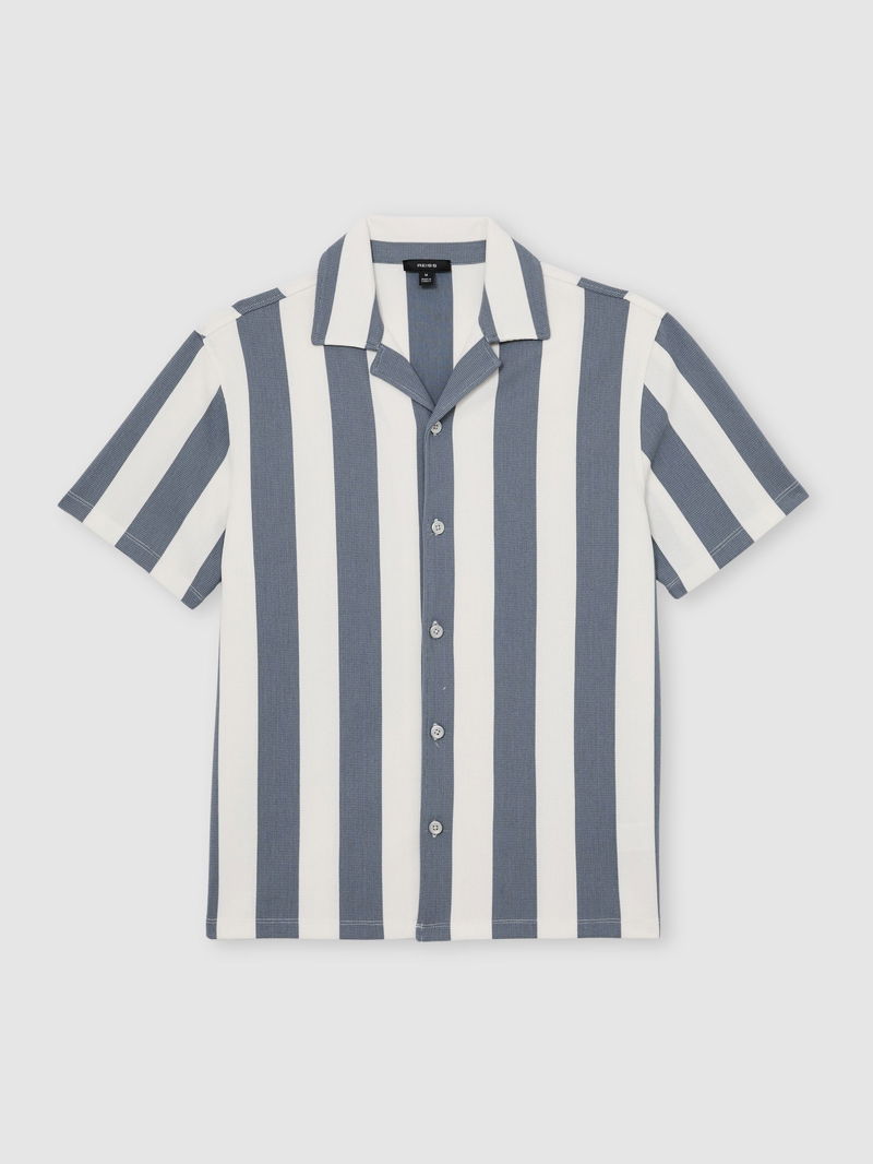 The Dexter shirt is crafted with block stripes and a lightly woven texture for subtle depth. It has a Cuban collar, short sleeves and front buttons.