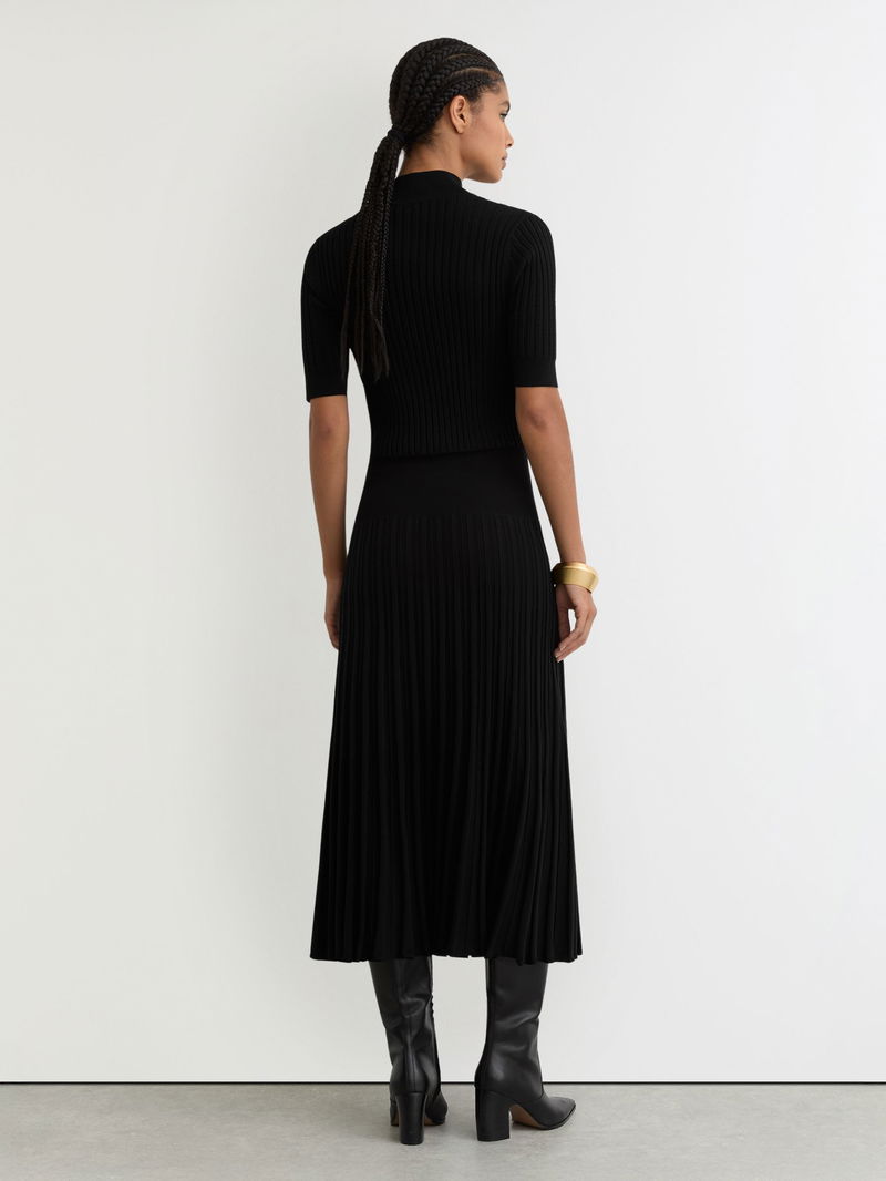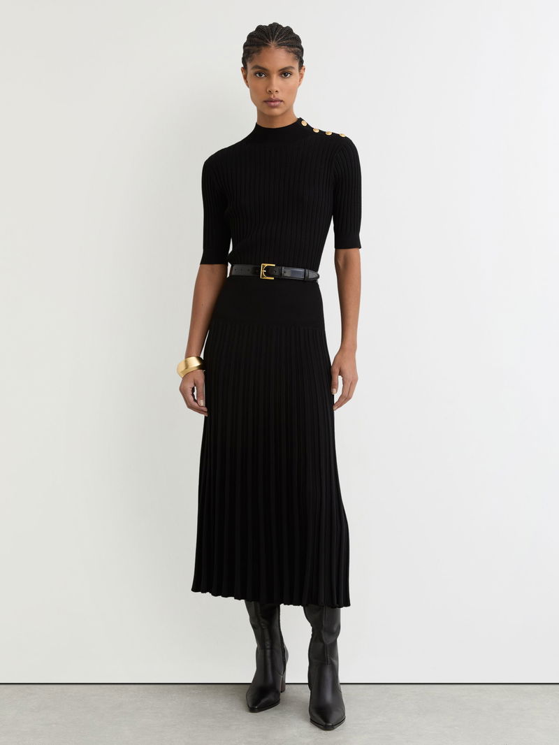 The Black Harriet dress is rib-knitted with a high neckline and short sleeves. Crest-embossed press-studs accent the shoulder, while a pleated skirt creates a refined silhouette.