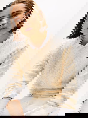 The Marie jumper is enhanced with wool and cashmere for a premium feel against the skin. Its open-stitch construction is enhanced with cable detailing for a unique texture that lends itself to layering.