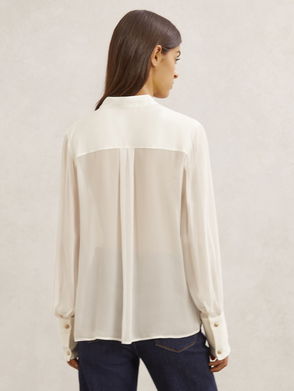 Extra fabric features to the seams of the lightweight Calista blouse for a draped, layered appearance. A versatile neck tie element is added.