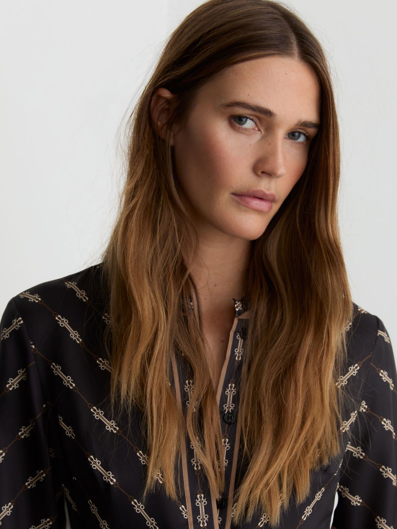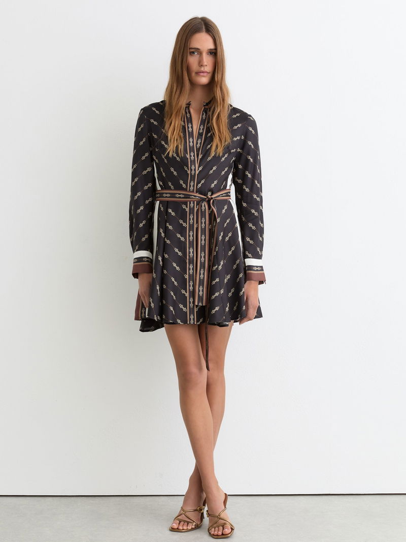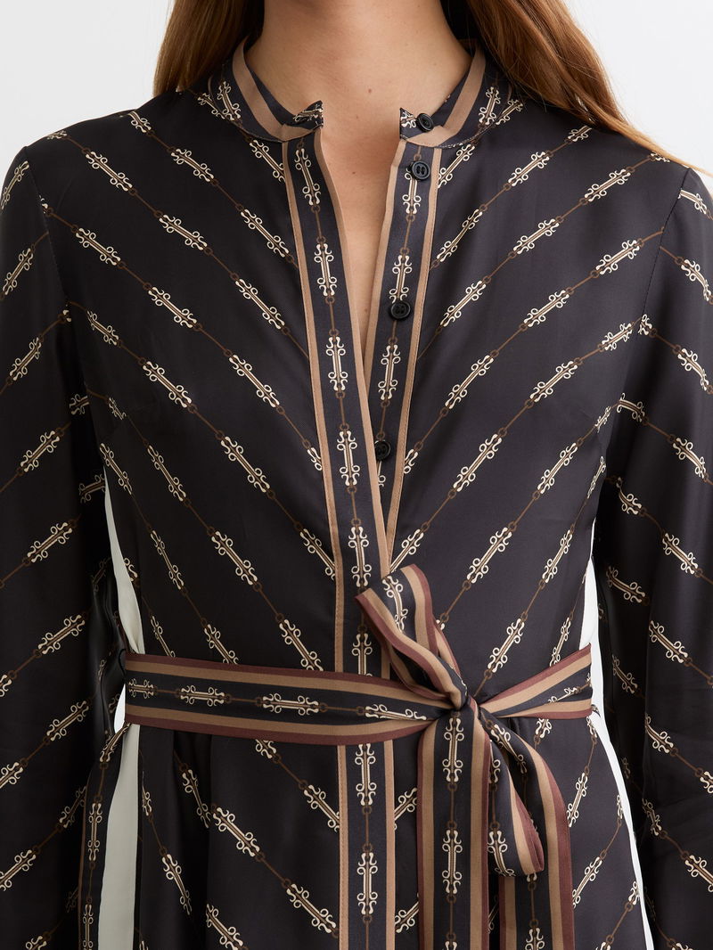 The Black Nina dress is crafted from smooth, drapey fabric in a vintage-inspired chain print. Contrasting stripes accent the sides and cuffs, with a self-tie belt defining the waist.