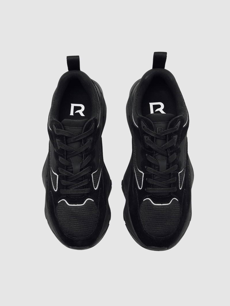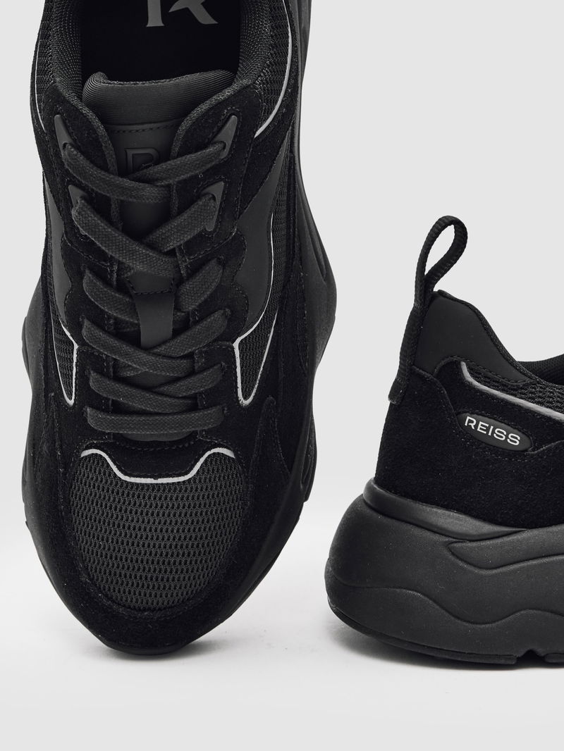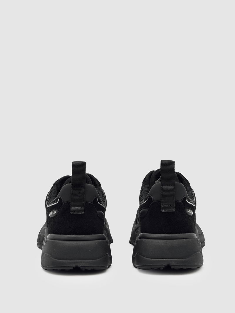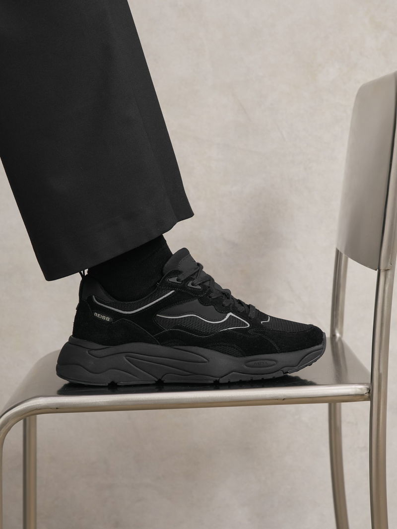 The Io black trainers reinterpret a retro runner silhouette with a layered mix of mesh, bonded leather, and suede.