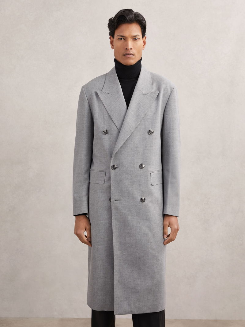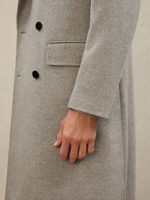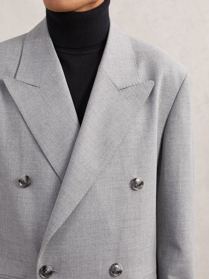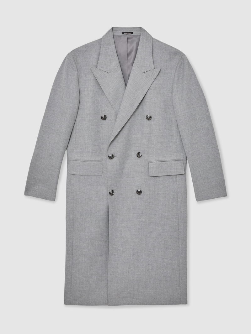 The Smarter overcoat is a double-breasted, relaxed-fit style with subtly shaped shoulders for a structured yet effortless silhouette. Peak lapels, flap welt pockets, and pick stitching add classic tailoring details, completed with a six-button front.