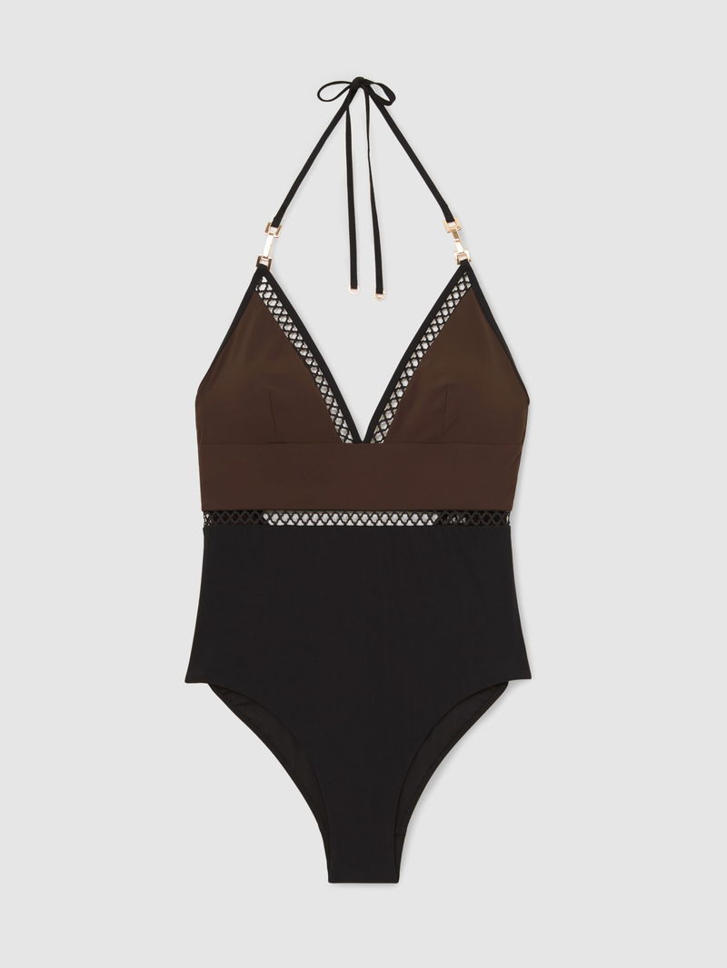 Colour-Block Lattice-Trim Swimsuit In Chocolate Brown/Black