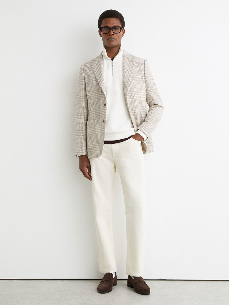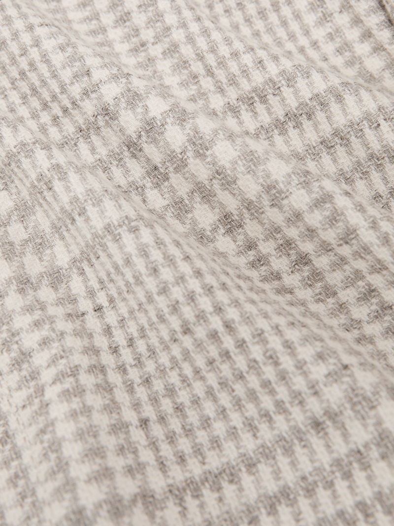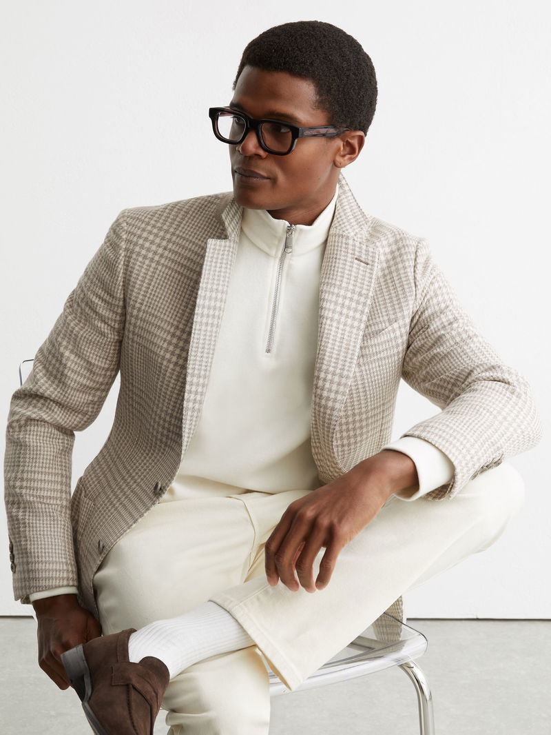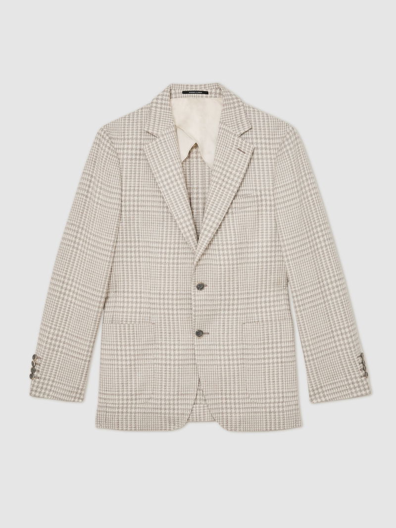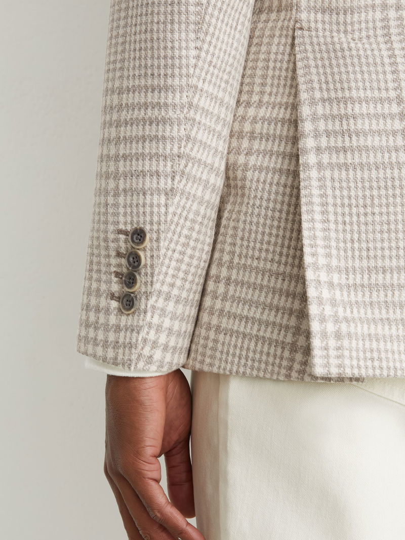 The Soft Grey Bardo blazer is a classic-fit, single-breasted design in a cotton-wool blend with a Prince of Wales check. It has notch lapels, buttoned cuffs and a two-button closure.