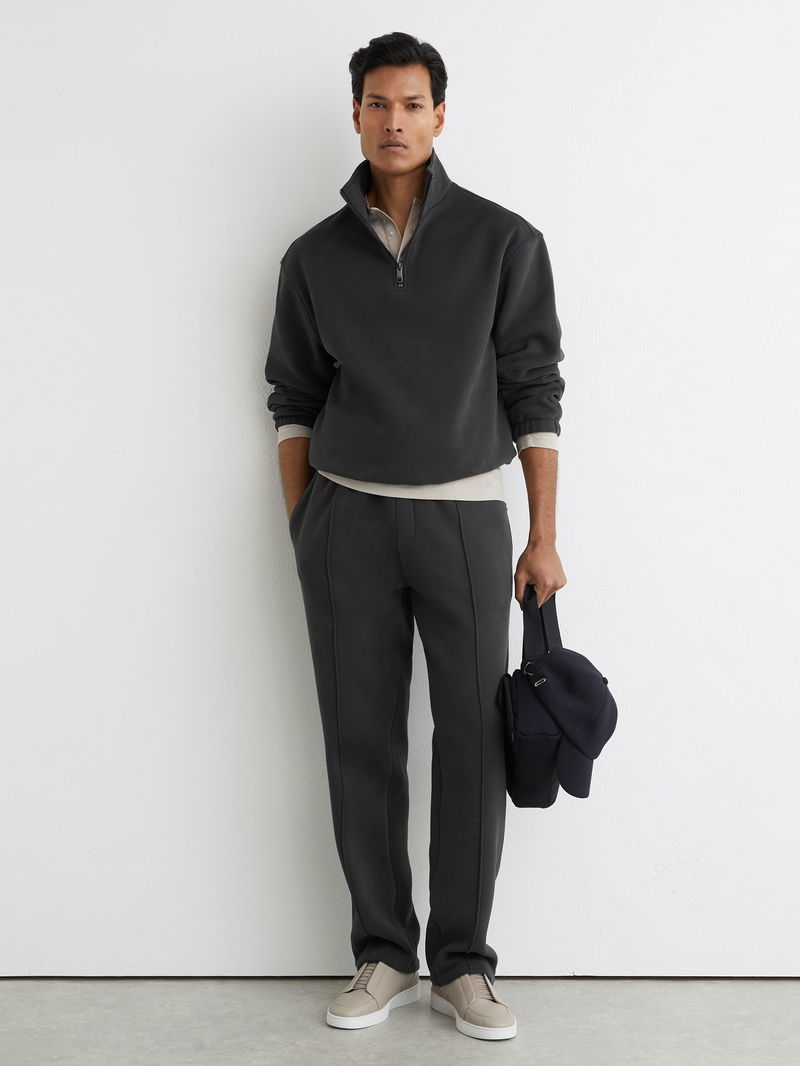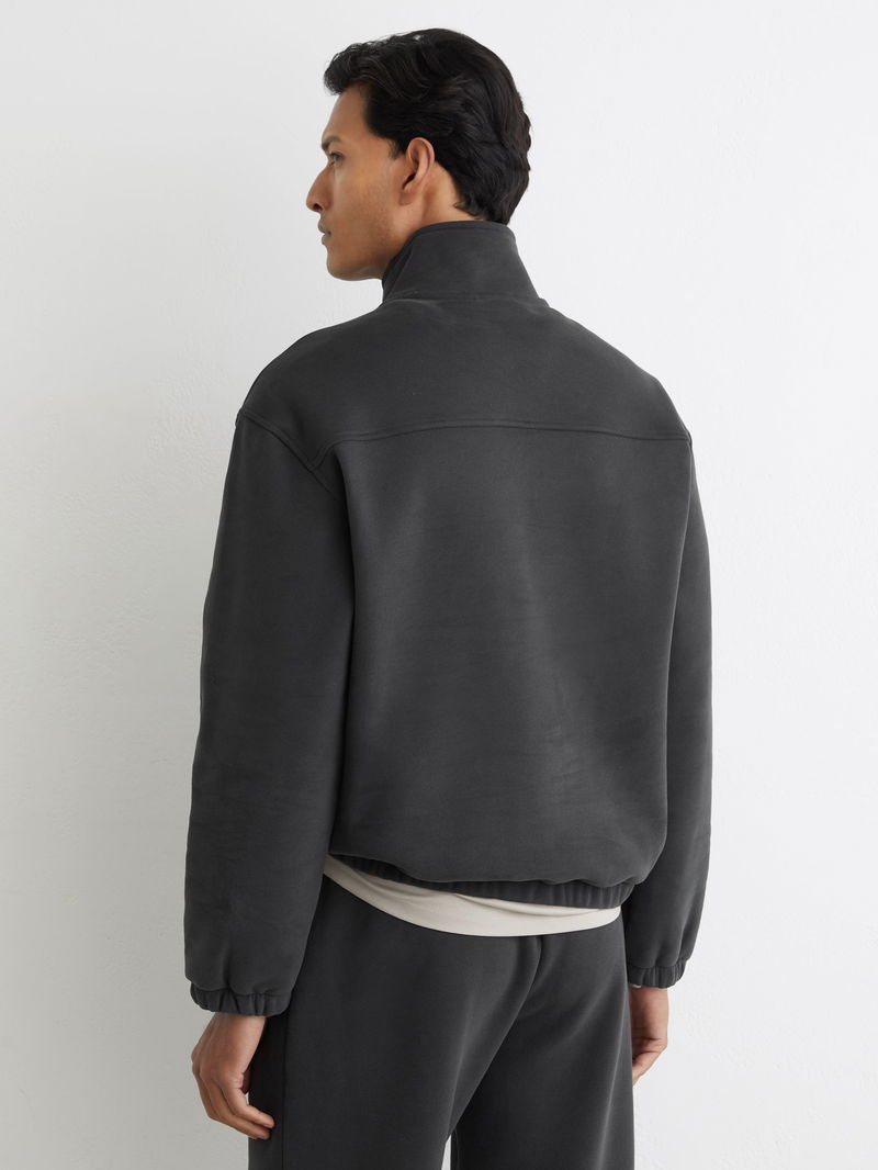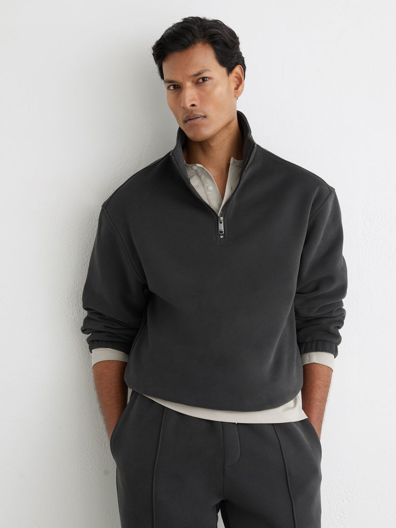 The Washed Black Quinn sweatshirt is crafted from midweight brushed jersey with a soft fleece-back finish. It has a funnel neck with a half-zip, and an elasticated hem and cuffs.