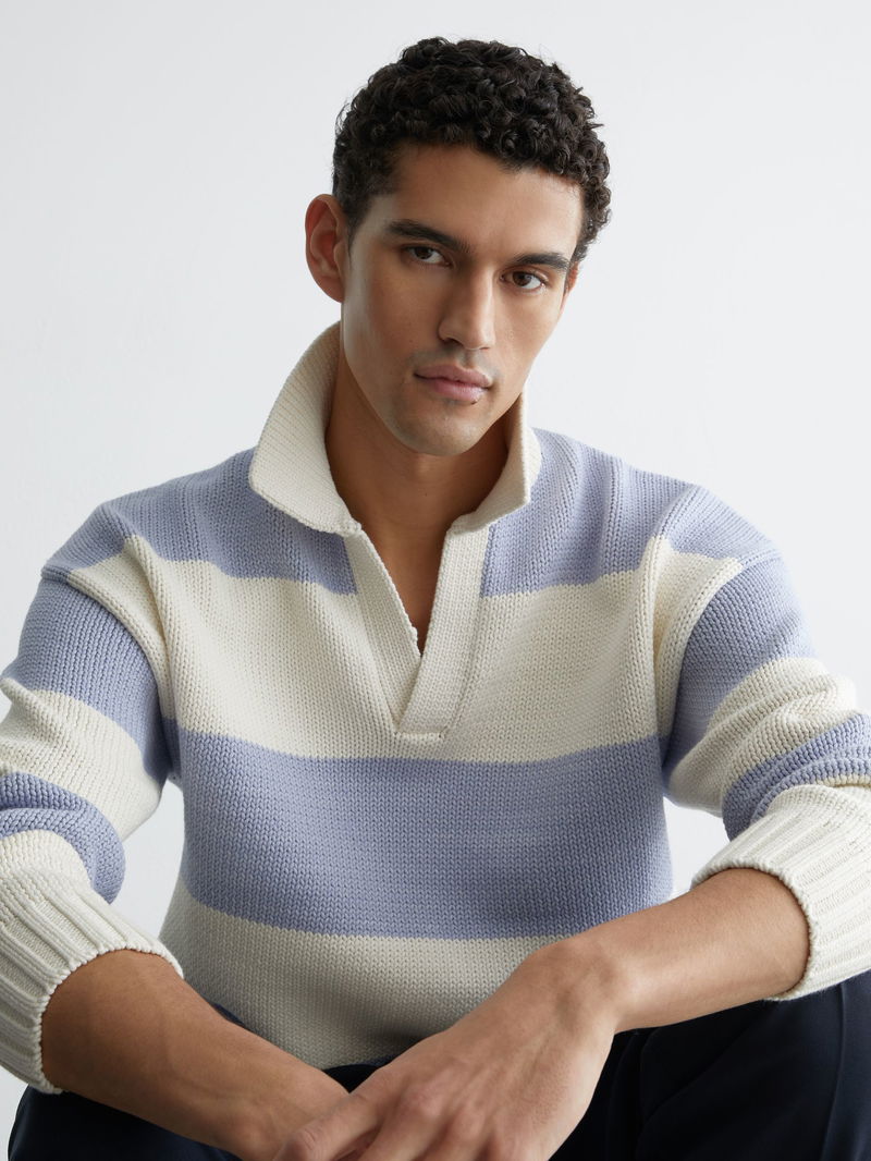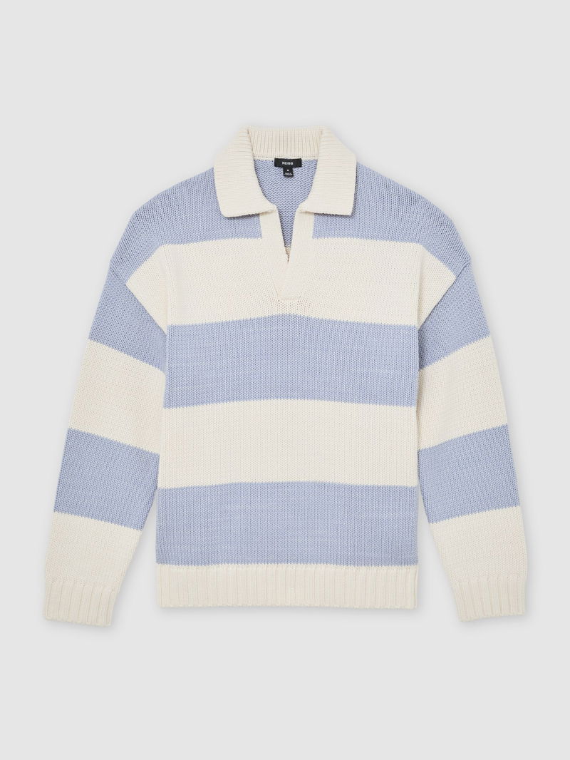 Cotton-Blend Open-Collar Rugby Jumper In White/Soft Blue Melange