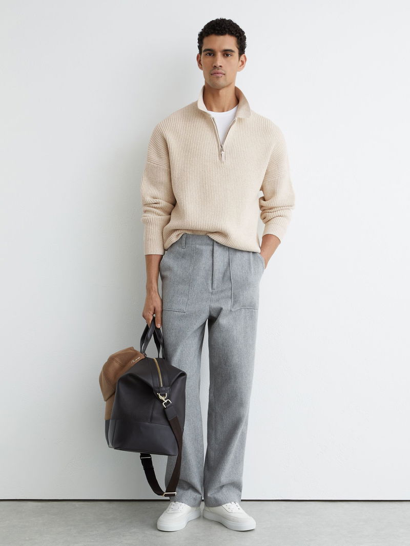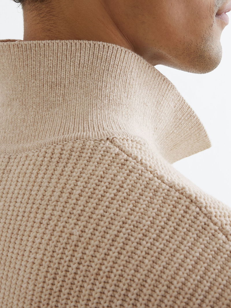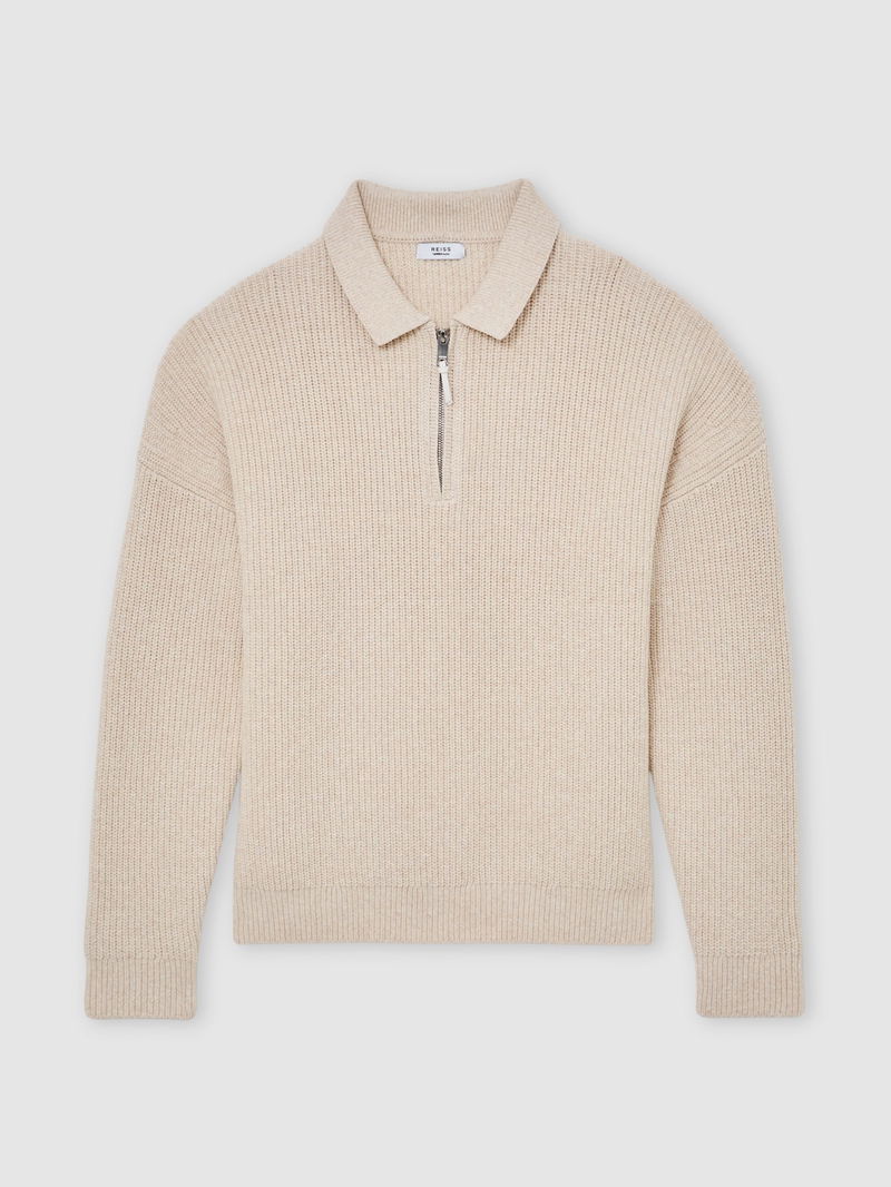 Cotton-Blend Rib Half-Zip Polo Jumper In Oatmeal Melange