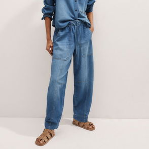 The blue Darcy shirt is crafted from pure cotton and is defined by a trompe l’oeil denim print, cleverly mimicking the texture and features of authentic denim. A cropped silhouette and drop shoulders enhance the modern feel of this unique design.