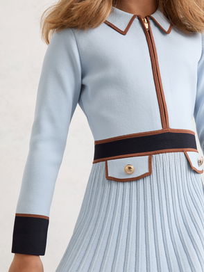 The Blue Bessie dress is crafted from 100% cotton, with tucked pleats at the bodice adding structure and detail. An asymmetric V-Neck and drop waist lend a modern touch, while the skirt flares gently for understated movement.