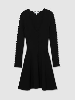 The Alma dress is knitted in a ribbed construction that hugs the body before gently flaring at the hem. Contrasting bands define the silhouette, framed by braided cable stitching for a crafted, tactile finish. A deep V-neckline and long sleeves complete the look with understated elegance.