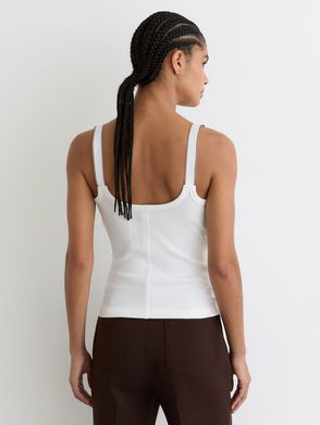 Knitted ribs offer a streamlined, textured finish. Rib knit. Craft stitching. Deep V-Neckline.
