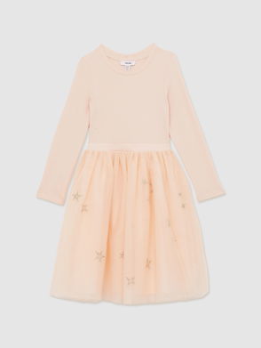 The Daisy dress has a loose-fitting tiered construction made from a lightweight sequin mesh with a printed mesh overlay. At the neckline, a naturally textured linen panel features a stylish contrast.