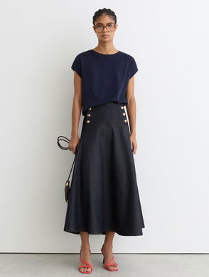 The Dani skirt is cut from a premium fabric into a midi-length that s both flattering and versatile. The defining feature is a front slip that transitions into a concealed button-front closure. The self-fabric waist tie and patch pockets have functional appeal. Tuck in a knitted top and finish with heels for evening elegance.