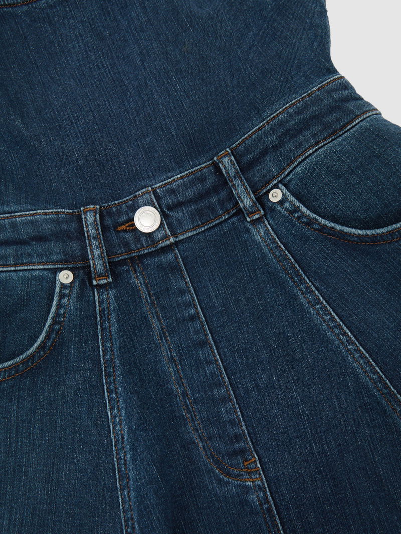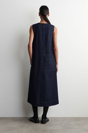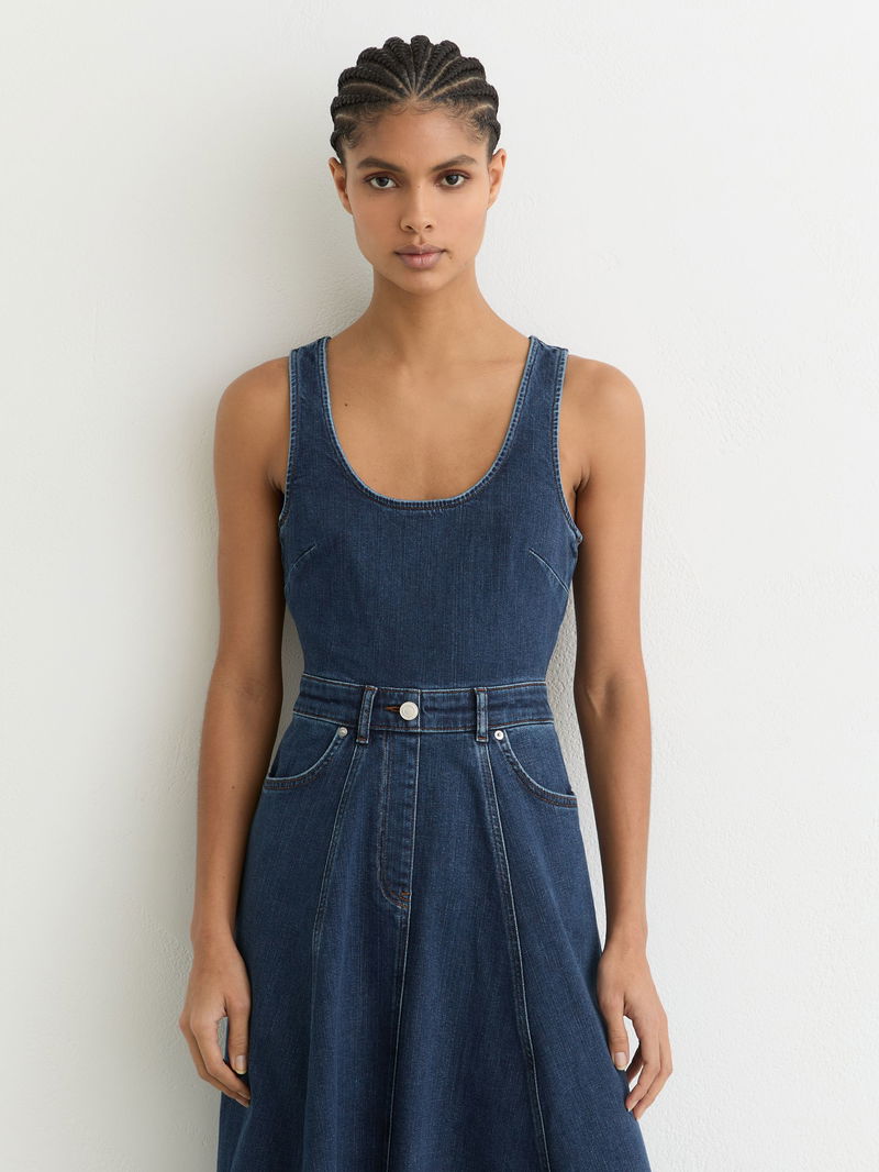 Denim Sleeveless Waisted Midi Dress In Indigo Blue