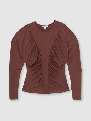 Gathers and folds at the neckline and side waist create elegant draping across the blush Daisy top. A soft, stretch-jersey fabrication and dropped shoulders add to the effortless look.