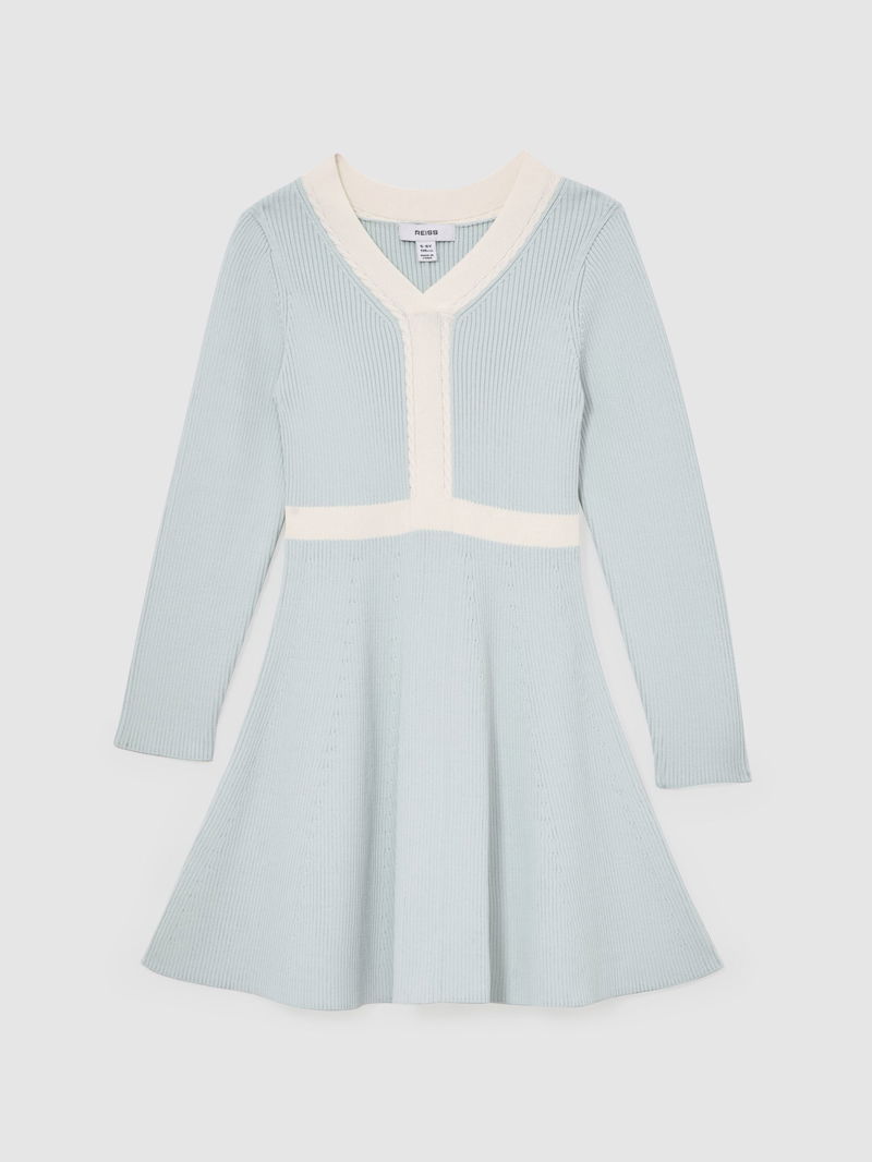 The Alma dress is knitted in a ribbed construction that stretches to fit, before gently flaring at the waist. Contrasting bands define the silhouette, framed by braided cable stitching for a crafted, tactile finish. A V-neckline and long sleeves complete the look.