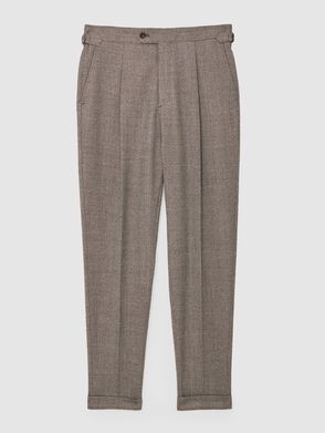 The Express trousers in ecru are a new smart-casual style in a slim-fit silhouette that features a subtle herringbone pattern. This design also features pressed creases and adjustable side-tabs. Wear it with a crisp shirt for work during spring.