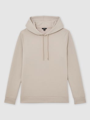 This taupe interlock jersey hoodie has a double-knit construction for supreme warmth, stretch, and softness.