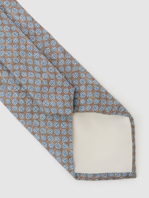 Crafted from a sumptuous foulard silk blend with a textured chevron finish, the Navy/Tobacco Pelosa tie is detailed with a diamond floral embroidered pattern. A standout piece to complete your tailored ensemble.