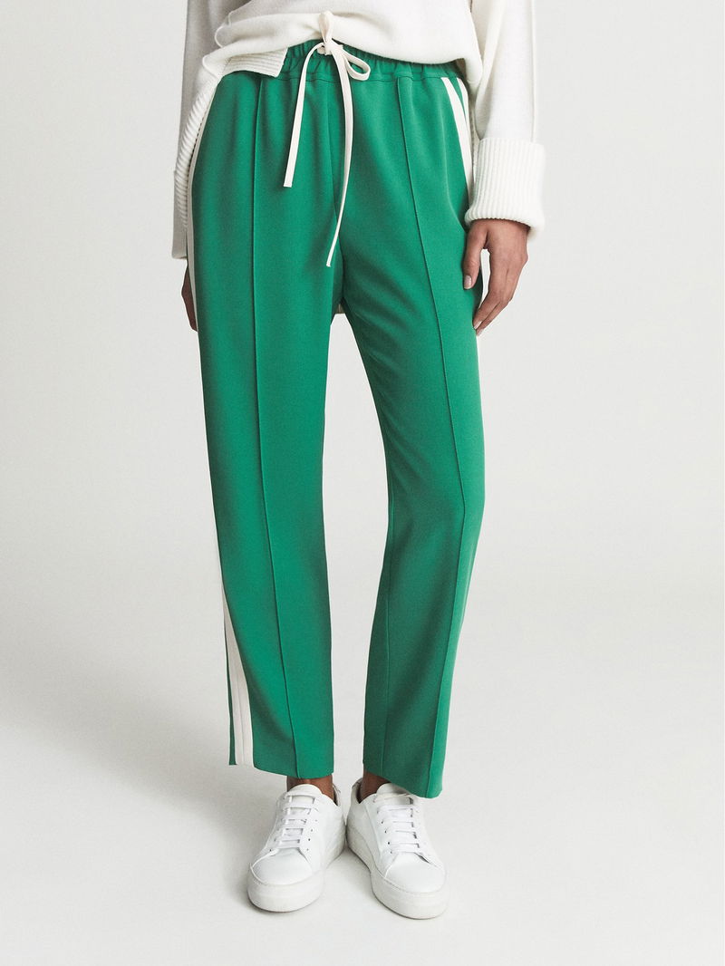 The Frazer Taper trousers in a bold green are crafted from a contemporary fabrication for a comfortable yet stylish finish. They are cut int The Frazer Taper trousers in a bold green are crafted from a contemporary fabrication for a comfortable yet stylish finish. They are cut into a tapered silhouette and finished with a sportswear-inspired contrast side stripe. Simply pair with a casual T-shirt or jumper for easy style and choose trainers or sandal heels depending on the mood.