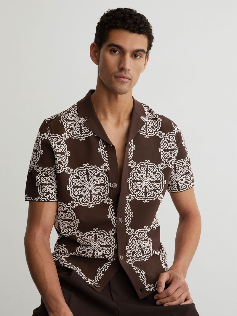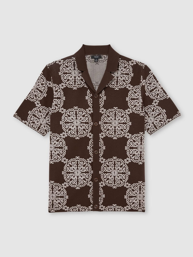 Jacquard Knit Cuban-Collar Shirt In Tobacco Brown/ White