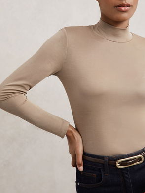 The Edith sand top is crafted from soft stretch-jersey and is cut for a modern cropped length. Ruching at the side seams creates a subtle texture to the front and back.