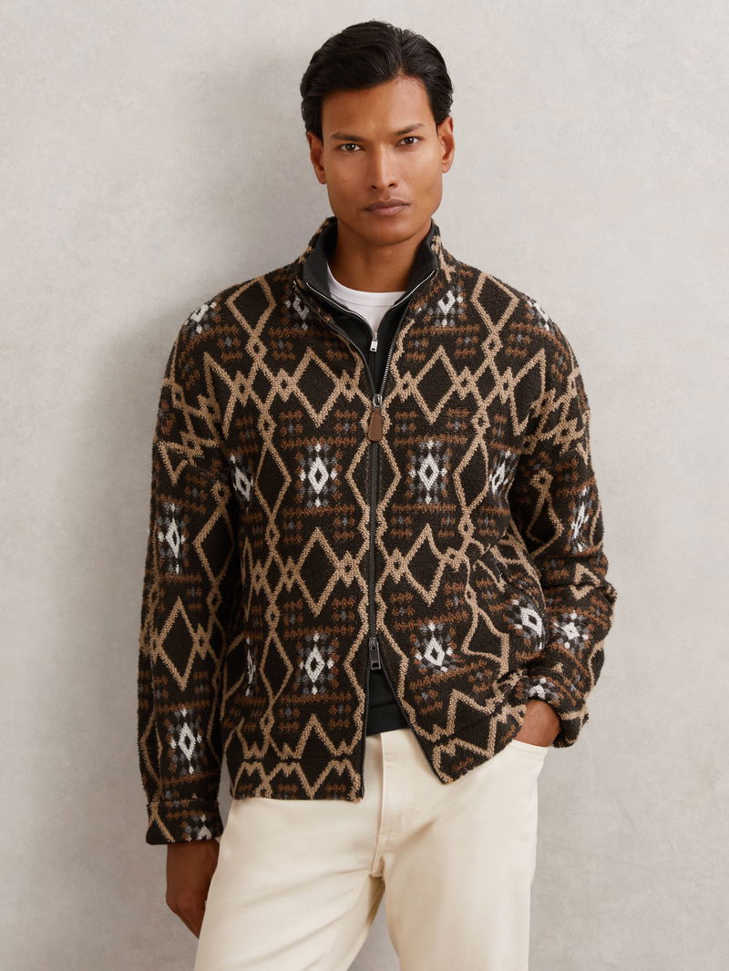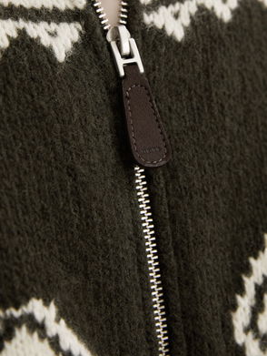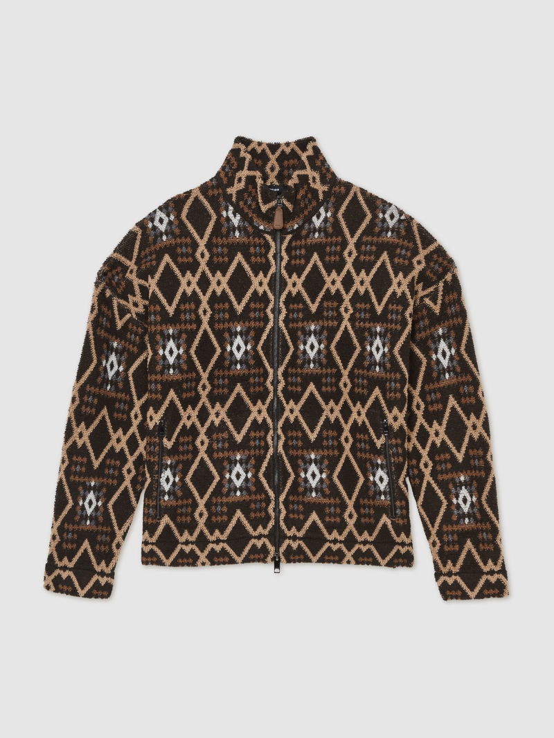 The Tuft jumper is crafted from a tactile bouclé-style knit and features a geometric Fair Isle pattern for a modern seasonal touch. Its funnel neck provides warmth and structure, while the dual zip-through front allows for versatile styling. Bouclé knit with wool. Geometric Fair Isle pattern. Funnel neck Side zip pockets. Dual zip with logo-stamped pull.