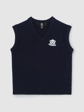 The Crosby vest is knitted from a soft wool blend with monogram embroidery at the chest. It’s shaped for a relaxed fit with rib-knit trims.