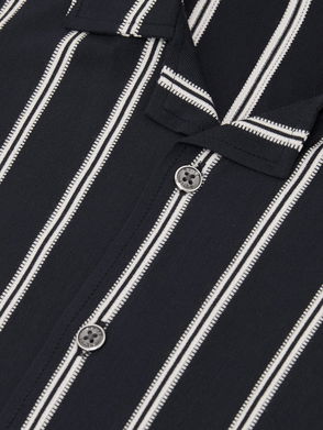 The Keaton polo shirt is crafted in a chunky knit, defined by horizontal alternating stripes that enhance their texture. A half-zip fastening adds a modern touch. Cotton blend. Knitted stripes. Polo collar. Half-zip.